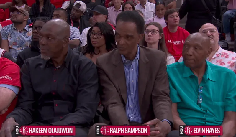 火箭官方晒出哈基姆-奥拉朱旺、拉尔夫-桑普森、埃尔文-海耶斯三位传奇球星今日亲临现场的照片。